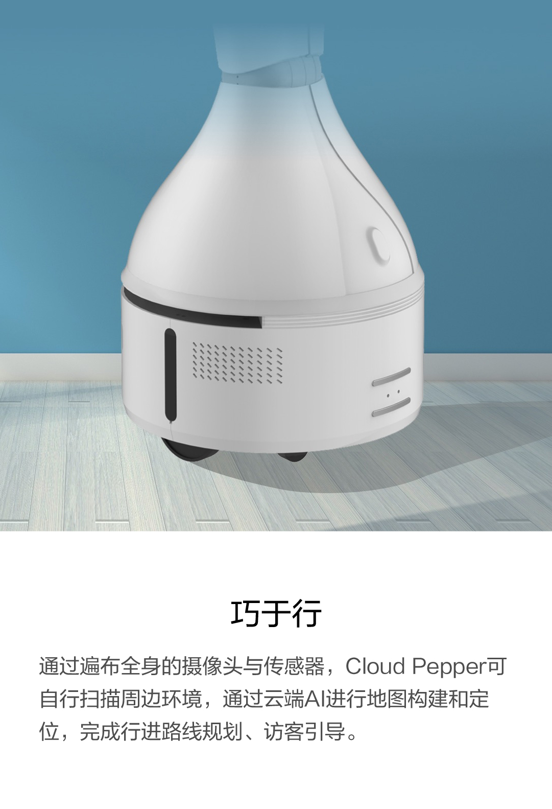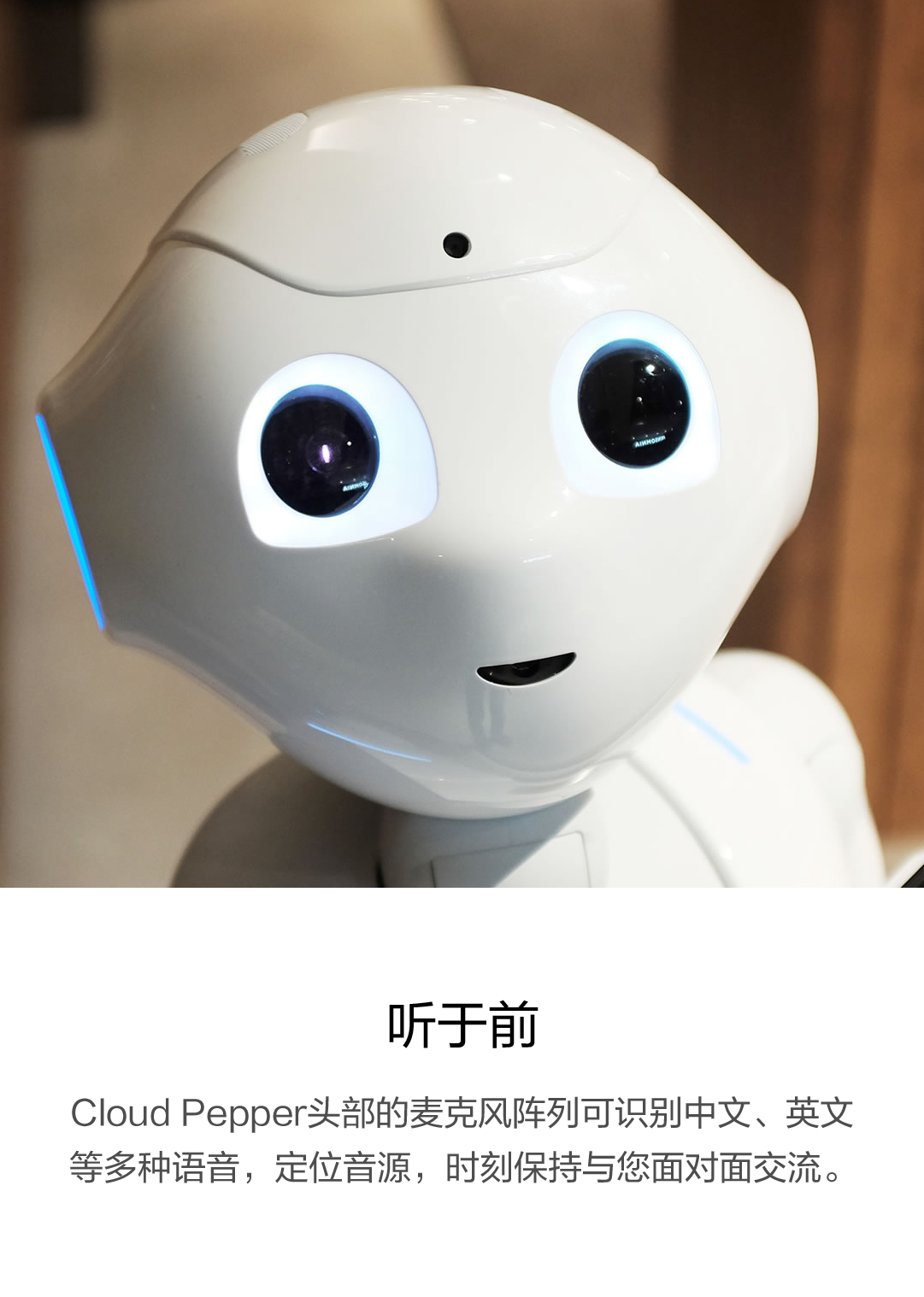 Cloud Pepper头部的麦克风阵列可识别中文、英文等多种语音,定位音源,时刻